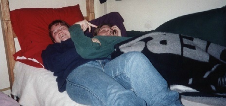 well.. um... this aint a party picture and I DONT want to know what those two are doing on my bed at college!!! haha.. the one with the blue shirt on would be my little kick a** cool sister, Brandi.. and the other chick (that would be flipping YOU off right now..) is Erika.. my cousin... but she's a LOSER cuz she goes to NSU!!! (sorry Erika..I had to say it....)